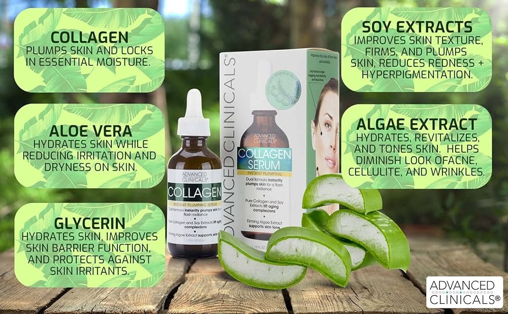 - Advanced Clinicals Collagen Serum promotes a plump and lifted look