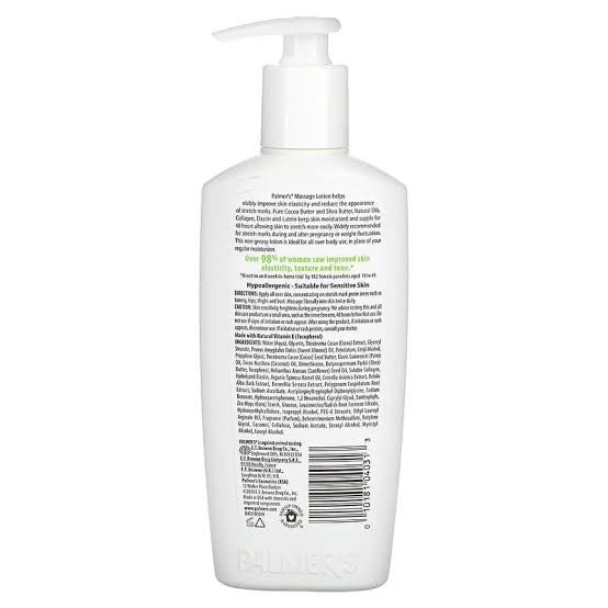 Palmers® Massage Lotion helps visibly improve skin elasticity and reduce the appearance of stretch marks. Pure Cocoa Butter and Shea Butter, Natural Oils, Collagen, Elastin and Lutein keep skin moisturized and supple for 48 hours allowing skin to stretch more easily. Widely recommended for stretch marks during and after pregnancy or weight fluctuation. This non-greasy lotion is ideal for all over body use, in place of your regular moisturizer.